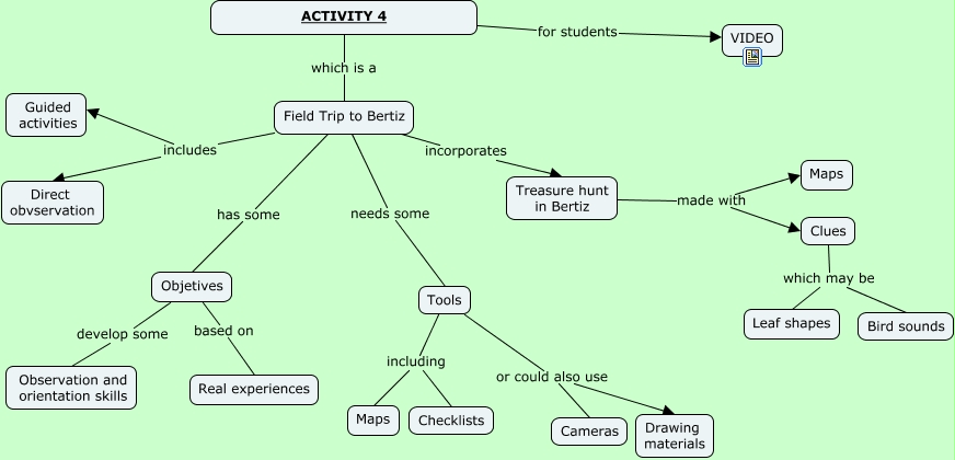 Este Cmap, tiene información relacionada con: Activity 4, Field Trip to Bertiz has some Objetives, Treasure hunt in Bertiz made with Clues, Objetives develop some Observation and orientation skills, Clues which may be Bird sounds, Field Trip to Bertiz includes Direct obvservation, Clues which may be Leaf shapes, Tools including Checklists, Tools or could also use Cameras, Objetives based on Real experiences, Field Trip to Bertiz incorporates Treasure hunt in Bertiz, Field Trip to Bertiz needs some Tools, Field Trip to Bertiz includes Guided activities, Tools including Maps, ACTIVITY 4 for students VIDEO, Treasure hunt in Bertiz made with Maps, Tools or could also use Drawing materials, ACTIVITY 4 which is a Field Trip to Bertiz