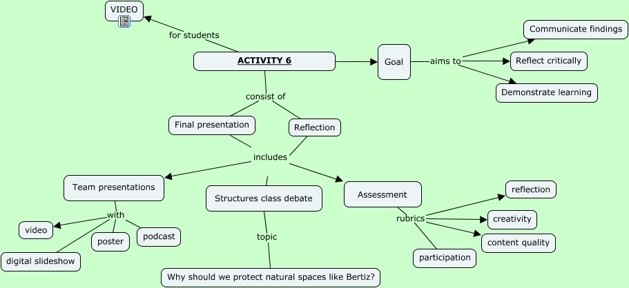 Este Cmap, tiene información relacionada con: Activity 6, Reflection includes Structures class debate, Team presentations with poster, Goal aims to Communicate findings, ACTIVITY 6 for students VIDEO, Goal aims to Reflect critically, Assessment rubrics reflection, Final presentation includes Assessment, Assessment rubrics content quality, Team presentations with podcast, Team presentations with video, Team presentations with digital slideshow, Reflection includes Team presentations, Structures class debate topic Why should we protect natural spaces like Bertiz?, Goal aims to Demonstrate learning, Reflection includes Assessment, Final presentation includes Structures class debate, ACTIVITY 6 consist of Final presentation, ACTIVITY 6 Goal, ACTIVITY 6 consist of Reflection, Assessment rubrics participation
