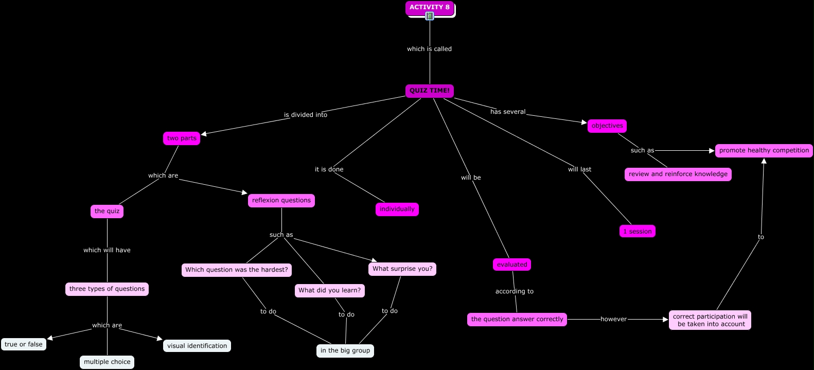 Este Cmap, tiene información relacionada con: Activity 8, three types of questions which are multiple choice, reflexion questions such as What did you learn?, QUIZ TIME! will last 1 session, the quiz which will have three types of questions, correct participation will be taken into account to promote healthy competition, the question answer correctly however correct participation will be taken into account, two parts which are reflexion questions, reflexion questions such as What surprise you?, objectives such as promote healthy competition, three types of questions which are true or false, QUIZ TIME! is divided into two parts, three types of questions which are visual identification, two parts which are the quiz, objectives such as review and reinforce knowledge, ACTIVITY 8 which is called QUIZ TIME!, What surprise you? to do in the big group, evaluated according to the question answer correctly, QUIZ TIME! it is done individually, QUIZ TIME! will be evaluated, QUIZ TIME! has several objectives