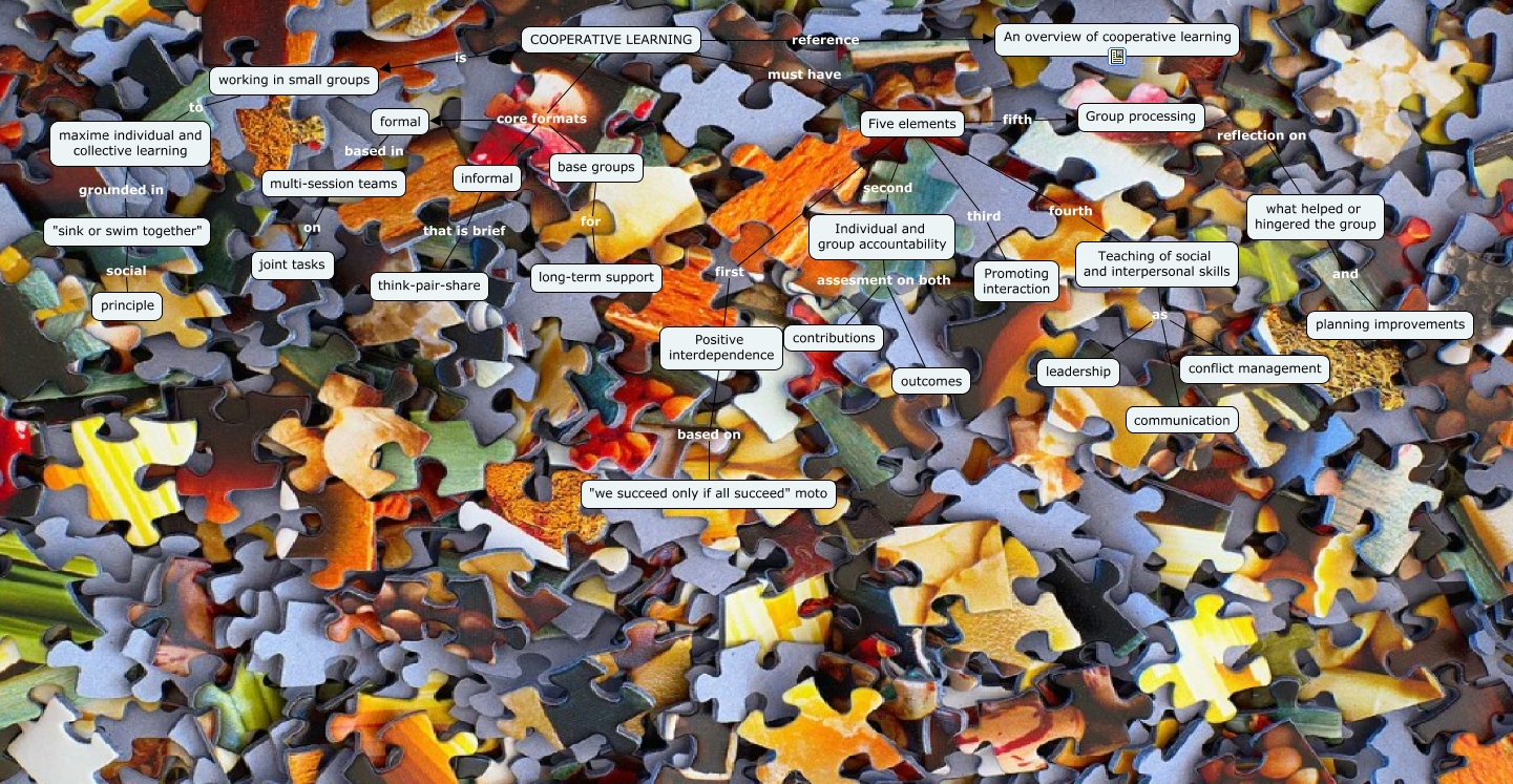 Este Cmap, tiene información relacionada con: Cooperative learning, multi-session teams on joint tasks, working in small groups to maxime individual and collective learning, Teaching of social and interpersonal skills as communication, Group processing reflection on what helped or hingered the group, Teaching of social and interpersonal skills as conflict management, what helped or hingered the group and planning improvements, informal that is brief think-pair-share, Teaching of social and interpersonal skills as leadership, Individual and group accountability assesment on both contributions, Positive interdependence based on "we succeed only if all succeed" moto, COOPERATIVE LEARNING is working in small groups, COOPERATIVE LEARNING core formats formal, "sink or swim together" social principle, Five elements first Positive interdependence, maxime individual and collective learning grounded in "sink or swim together", COOPERATIVE LEARNING reference An overview of cooperative learning, Five elements fourth Teaching of social and interpersonal skills, formal based in multi-session teams, Five elements second Individual and group accountability, base groups for long-term support