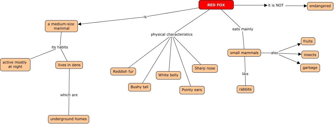 Este Cmap, tiene información relacionada con: info for the teacher, a medium-size mammal its habits lives in dens, RED FOX eats mainly small mammals, lives in dens which are underground homes, RED FOX is a medium-size mammal, RED FOX physical characteristics Sharp nose, RED FOX physical characteristics Reddish fur, small mammals also fruits, RED FOX physical characteristics White belly, small mammals also garbage, small mammals like rabbits, RED FOX physical characteristics Pointy ears, small mammals also insects, a medium-size mammal its habits active mostly at night, RED FOX physical characteristics Bushy tail, RED FOX it is NOT endangered