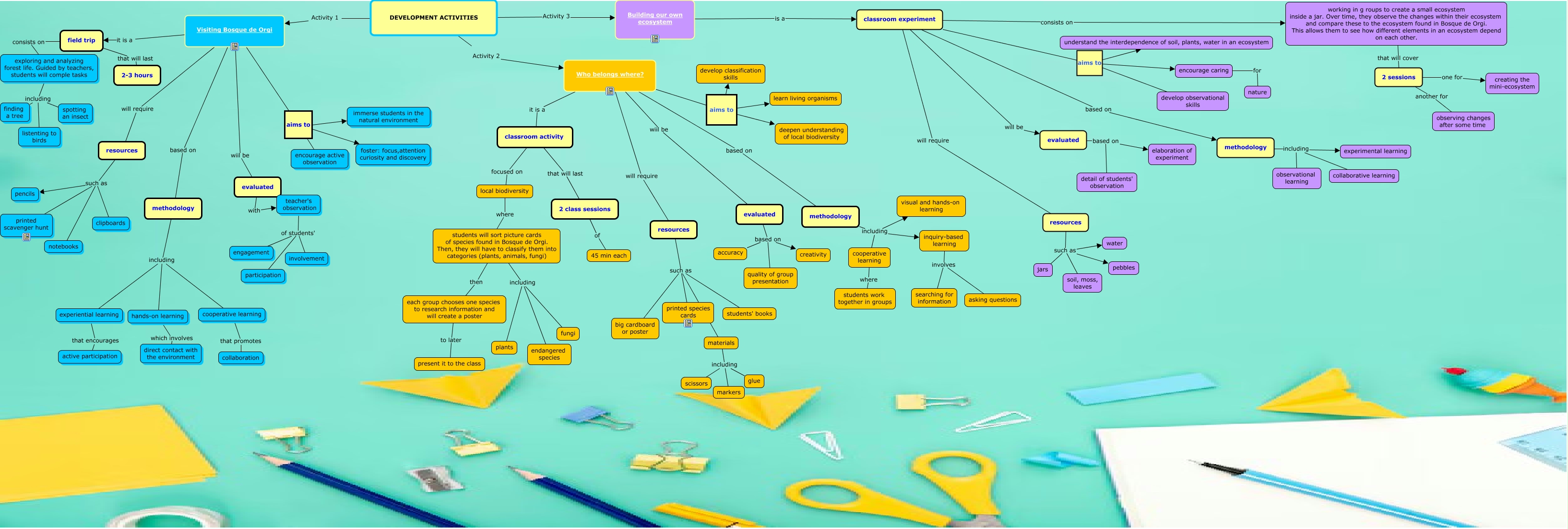 Este Cmap, tiene información relacionada con: Development activities, exploring and analyzing forest life. Guided by teachers, students will comple tasks including finding a tree, Visiting Bosque de Orgi it is a field trip, classroom experiment aims to develop observational skills, Who belongs where? aims to develop classification skills, resources such as water, local biodiversity where students will sort picture cards of species found in Bosque de Orgi. Then, they will have to classify them into categories (plants, animals, fungi), methodology including cooperative learning, Who belongs where? wiil be evaluated, evaluated based on accuracy, classroom activity that will last 2 class sessions, students will sort picture cards of species found in Bosque de Orgi. Then, they will have to classify them into categories (plants, animals, fungi) then each group chooses one species to research information and will create a poster, classroom experiment will be evaluated, resources such as clipboards, resources such as pencils, resources such as students' books, methodology including observational learning, evaluated based on elaboration of experiment, methodology including cooperative learning, Who belongs where? based on methodology, classroom activity focused on local biodiversity
