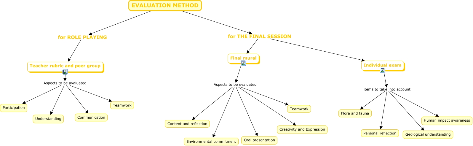 Este Cmap, tiene información relacionada con: evaluation, Individual exam items to take into account Flora and fauna, Final mural Aspects to be evaluated Teamwork, Final mural Aspects to be evaluated Environmental commitment, Individual exam items to take into account Geological understanding, Final mural Aspects to be evaluated Oral presentation, Teacher rubric and peer group Aspects to be avaluated Communication, Teacher rubric and peer group Aspects to be avaluated Participation, Final mural Aspects to be evaluated Creativity and Expression, Teacher rubric and peer group Aspects to be avaluated Teamwork, Individual exam items to take into account Human impact awareness, EVALUATION METHOD for THE FINAL SESSION Final mural, EVALUATION METHOD for THE FINAL SESSION Individual exam, Individual exam items to take into account Personal reflection, Teacher rubric and peer group Aspects to be avaluated Understanding, EVALUATION METHOD for ROLE PLAYING Teacher rubric and peer group, Final mural Aspects to be evaluated Content and refelction