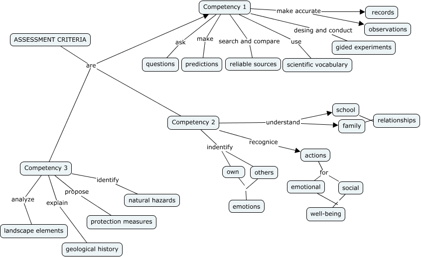 Este Cmap, tiene información relacionada con: Assessment criteria, family relationships, Competency 2 understand school, Competency 3 analyze landscape elements, emotional well-being, actions for emotional, Competency 3 explain geological history, Competency 2 indentify own, Competency 1 ask questions, Competency 1 make accurate observations, own emotions, Competency 1 make predictions, actions for social, others emotions, Competency 2 indentify others, ASSESSMENT CRITERIA are Competency 1, Competency 1 make accurate records, social well-being, Competency 1 use scientific vocabulary, Competency 3 identify natural hazards, Competency 1 desing and conduct gided experiments