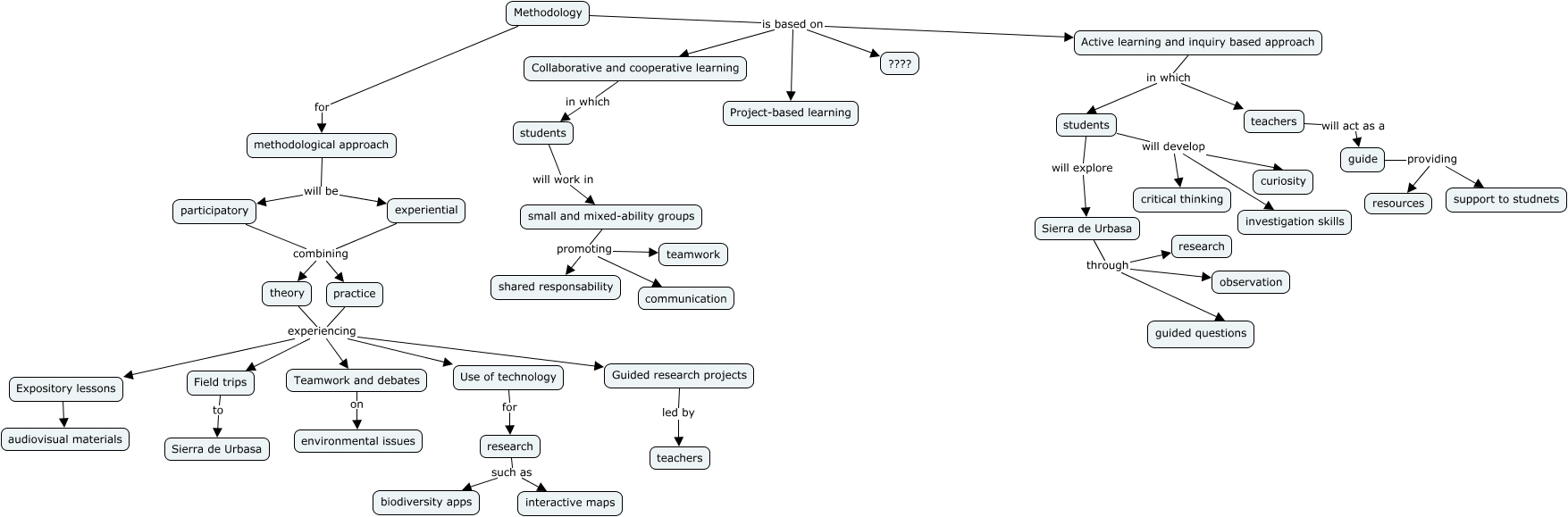 Este Cmap, tiene información relacionada con: Sin Título, Field trips to Sierra de Urbasa, students will explore Sierra de Urbasa, methodological approach will be participatory, practice experiencing Expository lessons, research such as biodiversity apps, Sierra de Urbasa through guided questions, students will develop investigation skills, theory experiencing Teamwork and debates, small and mixed-ability groups promoting teamwork, small and mixed-ability groups promoting shared responsability, theory experiencing Field trips, Methodology is based on Collaborative and cooperative learning, Sierra de Urbasa through research, Methodology is based on ????, theory experiencing Guided research projects, guide providing resources, Use of technology for research, guide providing support to studnets, experiential combining theory, research such as interactive maps