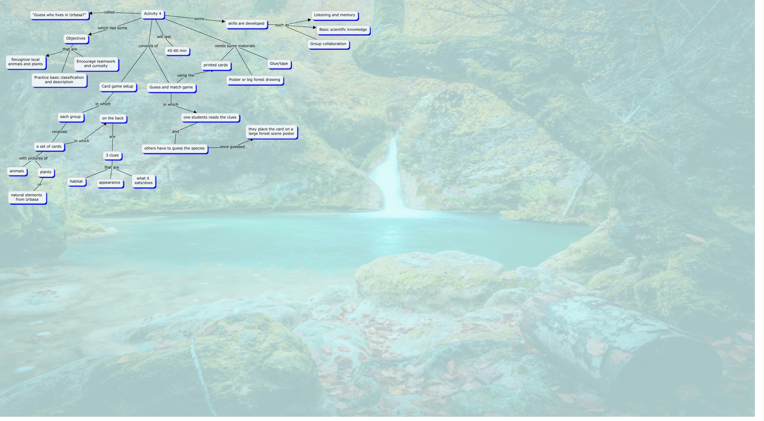 Este Cmap, tiene información relacionada con: ACTIVITY 4, a set of cards with pictures of plants, Activity 4 will last 45-60 min, 3 clues that are what it eats/does, Card game setup in which each group, Guess and match game in which one students reads the clues, Objectives that are Practice basic classification and description, Activity 4 consists of Card game setup, Activity 4 some skills are developed, skills are developed such as Group collaboration, a set of cards with pictures of animals, Activity 4 needs some materials Poster or big forest drawing, a set of cards in which on the back, Activity 4 which has some Objectives, others have to guess the species once guessed they place the card on a large forest scene poster, 3 clues that are appearance, skills are developed such as Listening and memory, Objectives that are Recognize local animals and plants, skills are developed such as Basic scientific knowledge, Activity 4 needs some materials Glue/tape, Activity 4 needs some materials printed cards