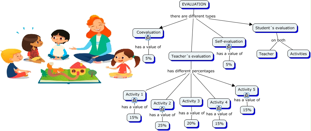 Este Cmap, tiene información relacionada con: Evaluation, EVALUATION there are different types Self-evaluation, Student´s evaluation on both Activities, Teacher´s evaluation has different percentages Activity 3, Activity 5 has a value of 15%, Activity 3 has a value of 20%, Self-evaluation has a value of 5%, EVALUATION there are different types Student´s evaluation, Teacher´s evaluation has different percentages Activity 2, Activity 2 has a value of 25%, Activity 1 has a value of 15%, Student´s evaluation on both Teacher, Teacher´s evaluation has different percentages Activity 5, EVALUATION there are different types Coevaluation, Teacher´s evaluation has different percentages Activity 1, Teacher´s evaluation has different percentages Activity 4, Coevaluation has a value of 5%, EVALUATION there are different types Teacher´s evaluation, Activity 4 has a value of 15%