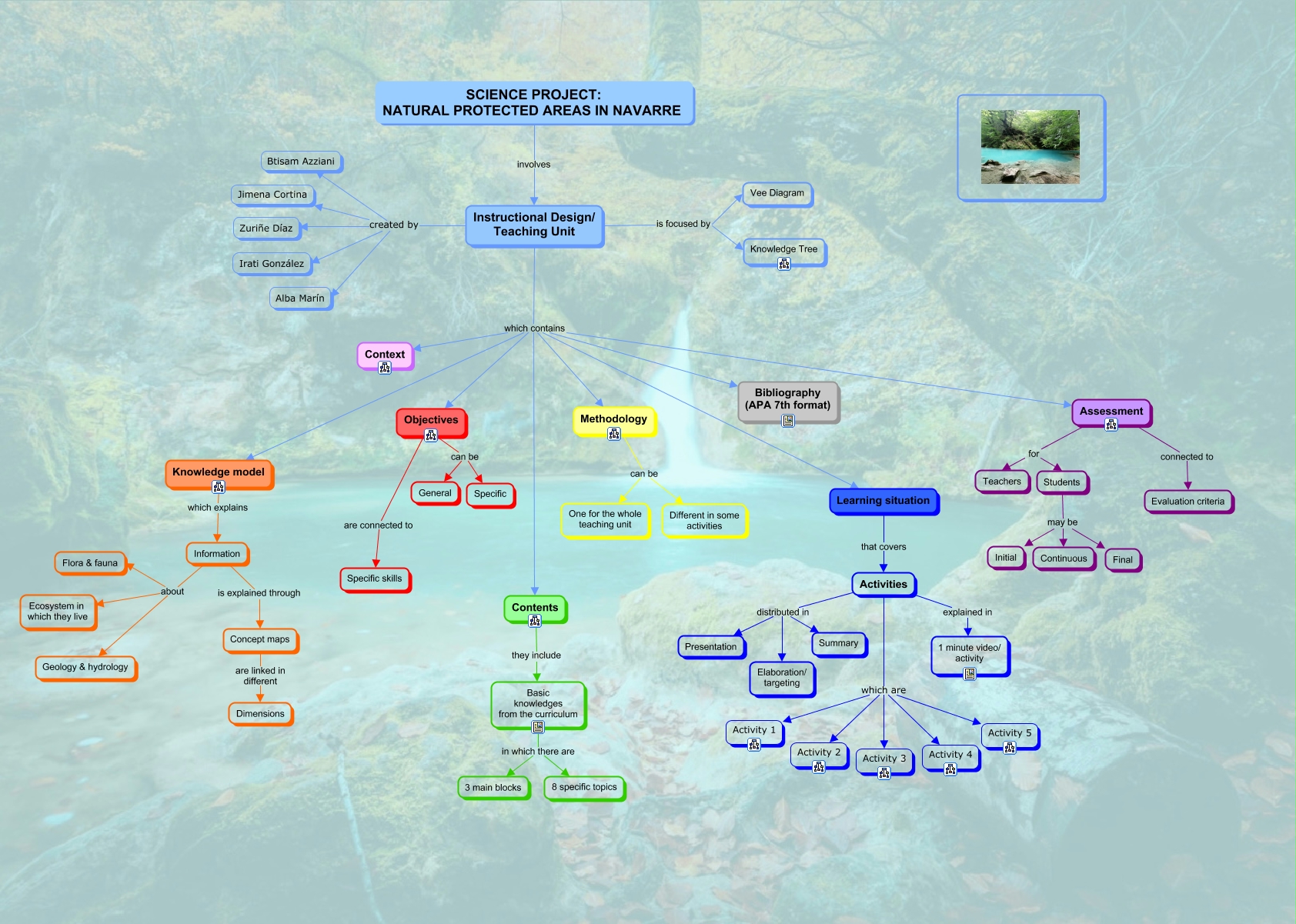 Este Cmap, tiene información relacionada con: PA5 INSTRUCTIONAL MODULE, Instructional Design/ Teaching Unit which contains Contents, Basic knowledges from the curriculum in which there are 8 specific topics, Information about Geology & hydrology, Information about Flora & fauna, Students may be Initial, Instructional Design/ Teaching Unit created by Jimena Cortina, Objectives can be Specific, Learning situation that covers Activities, Instructional Design/ Teaching Unit which contains Objectives, Activities which are Activity 3, Methodology can be One for the whole teaching unit, Instructional Design/ Teaching Unit created by Btisam Azziani, Activities distributed in Summary, Activities distributed in Elaboration/ targeting, Instructional Design/ Teaching Unit which contains Methodology, Instructional Design/ Teaching Unit is focused by Knowledge Tree, Instructional Design/ Teaching Unit which contains Knowledge model, Activities explained in 1 minute video/ activity, Basic knowledges from the curriculum in which there are 3 main blocks, Students may be Continuous