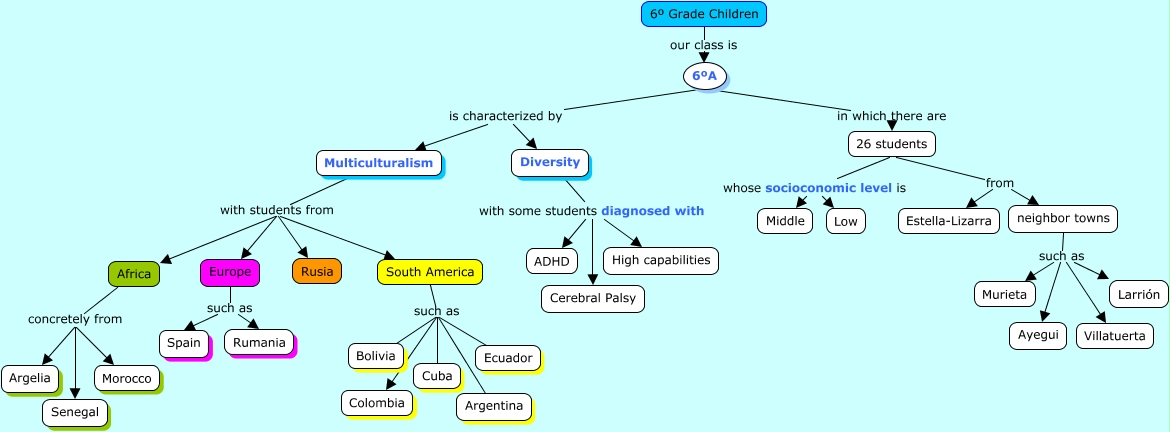 Este Cmap, tiene información relacionada con: 5. CONTEXT (Our students), Ecuador such as Colombia, 6ºA in which there are 26 students, 26 students whose socioconomic level is Low, Multiculturalism with students from Rusia, Europe such as Rumania, Diversity with some students diagnosed with ADHD, Diversity with some students diagnosed with High capabilities, Multiculturalism with students from Europe, Multiculturalism with students from South America, South America such as Colombia, 26 students from neighbor towns, neighbor towns such as Murieta, Bolivia such as Colombia, Multiculturalism with students from Africa, Cuba such as Colombia, neighbor towns such as Larrión, 6ºA is characterized by Diversity, neighbor towns such as Villatuerta, 6ºA is characterized by Multiculturalism, 26 students from Estella-Lizarra