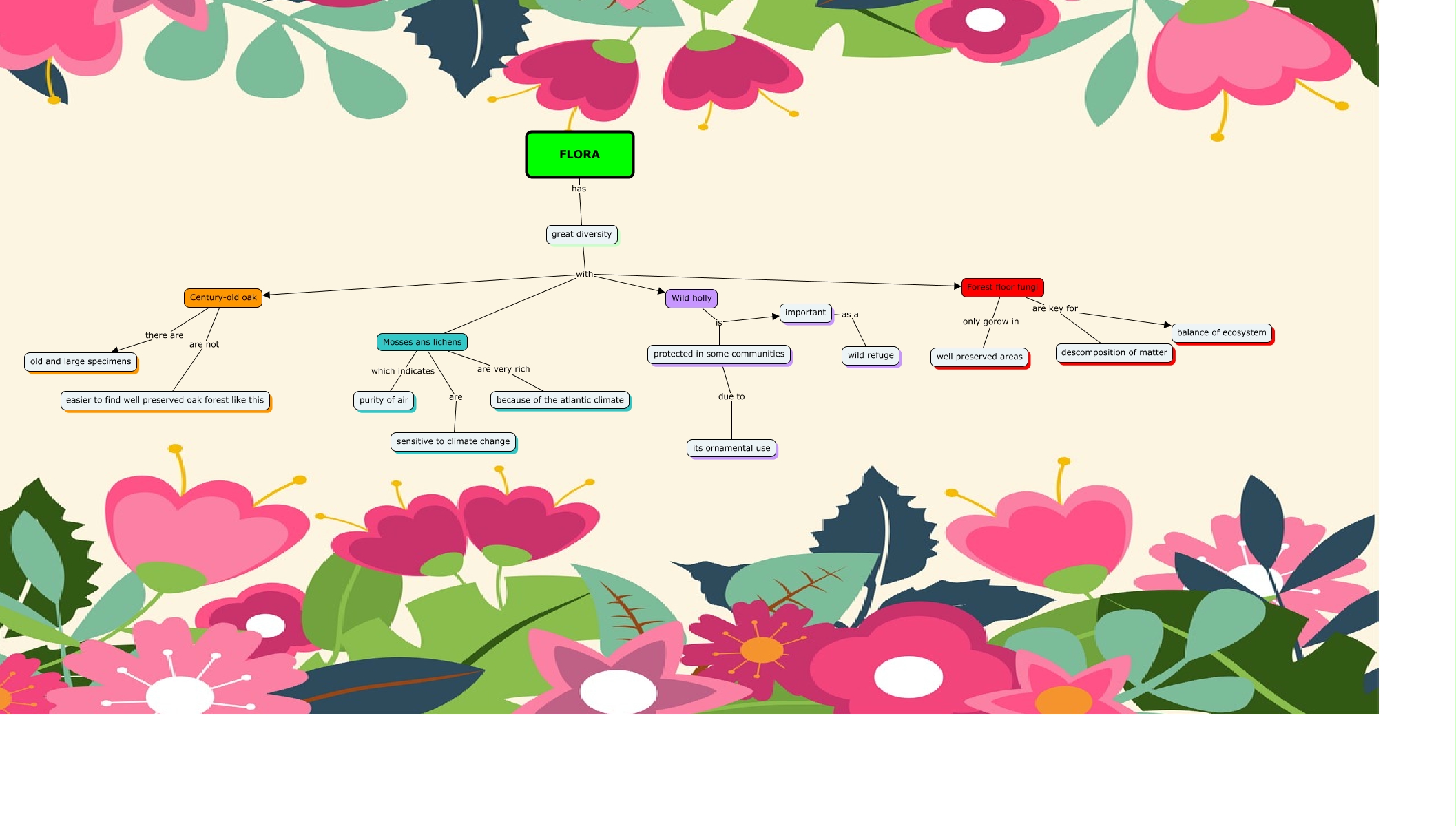 Este Cmap, tiene información relacionada con: FLORA, Century-old oak there are old and large specimens, FLORA has great diversity, Wild holly is important, Mosses ans lichens are sensitive to climate change, great diversity with Forest floor fungi, Forest floor fungi only gorow in well preserved areas, great diversity with Wild holly, Forest floor fungi are key for descomposition of matter, important as a wild refuge, protected in some communities due to its ornamental use, great diversity with Century-old oak, great diversity with Mosses ans lichens, Mosses ans lichens which indicates purity of air, Forest floor fungi are key for balance of ecosystem, Wild holly is protected in some communities, Century-old oak are not easier to find well preserved oak forest like this, Mosses ans lichens are very rich because of the atlantic climate