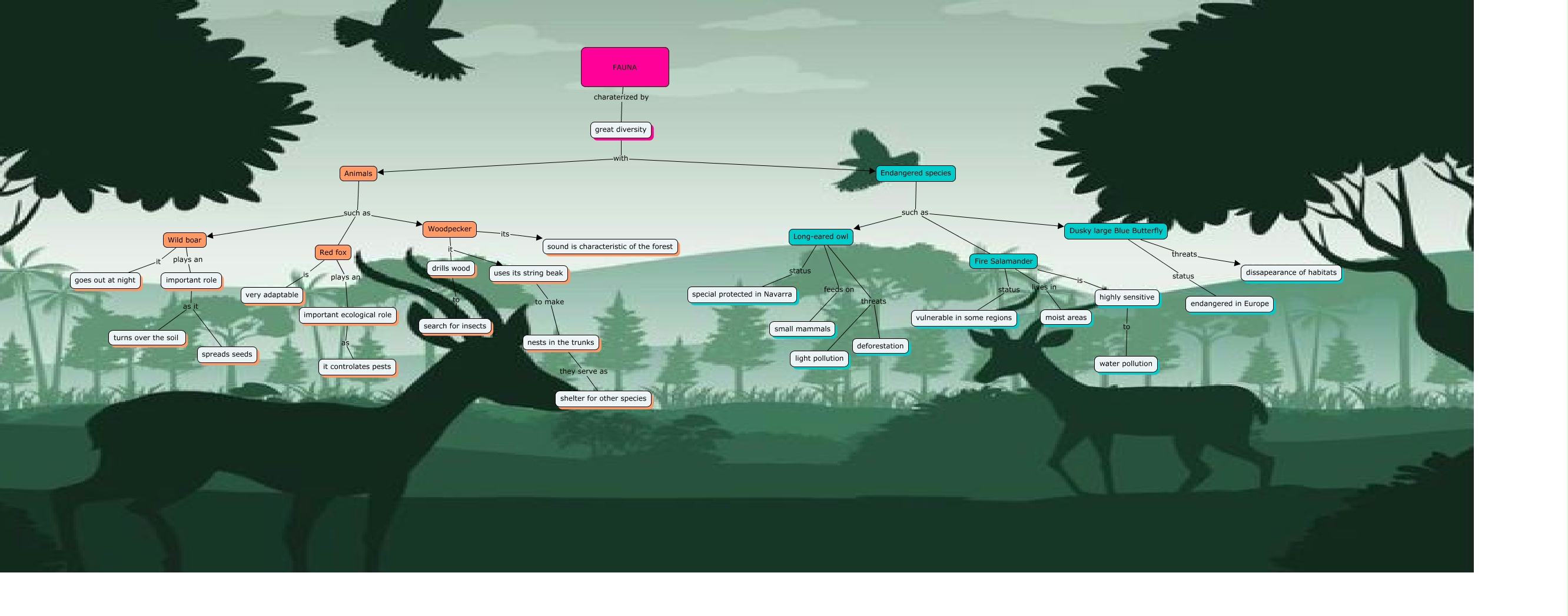 Este Cmap, tiene información relacionada con: FAUNA, Endangered species such as Fire Salamander, Dusky large Blue Butterfly threats dissapearance of habitats, Fire Salamander status vulnerable in some regions, important role as it spreads seeds, Woodpecker it drills wood, Endangered species such as Dusky large Blue Butterfly, highly sensitive to water pollution, Red fox is very adaptable, Animals such as Red fox, Fire Salamander lives in moist areas, FAUNA charaterized by great diversity, Fire Salamander is highly sensitive, Long-eared owl threats deforestation, Wild boar plays an important role, Long-eared owl threats light pollution, Woodpecker its sound is characteristic of the forest, Red fox plays an important ecological role, important ecological role as it controlates pests, Animals such as Wild boar, great diversity with Endangered species
