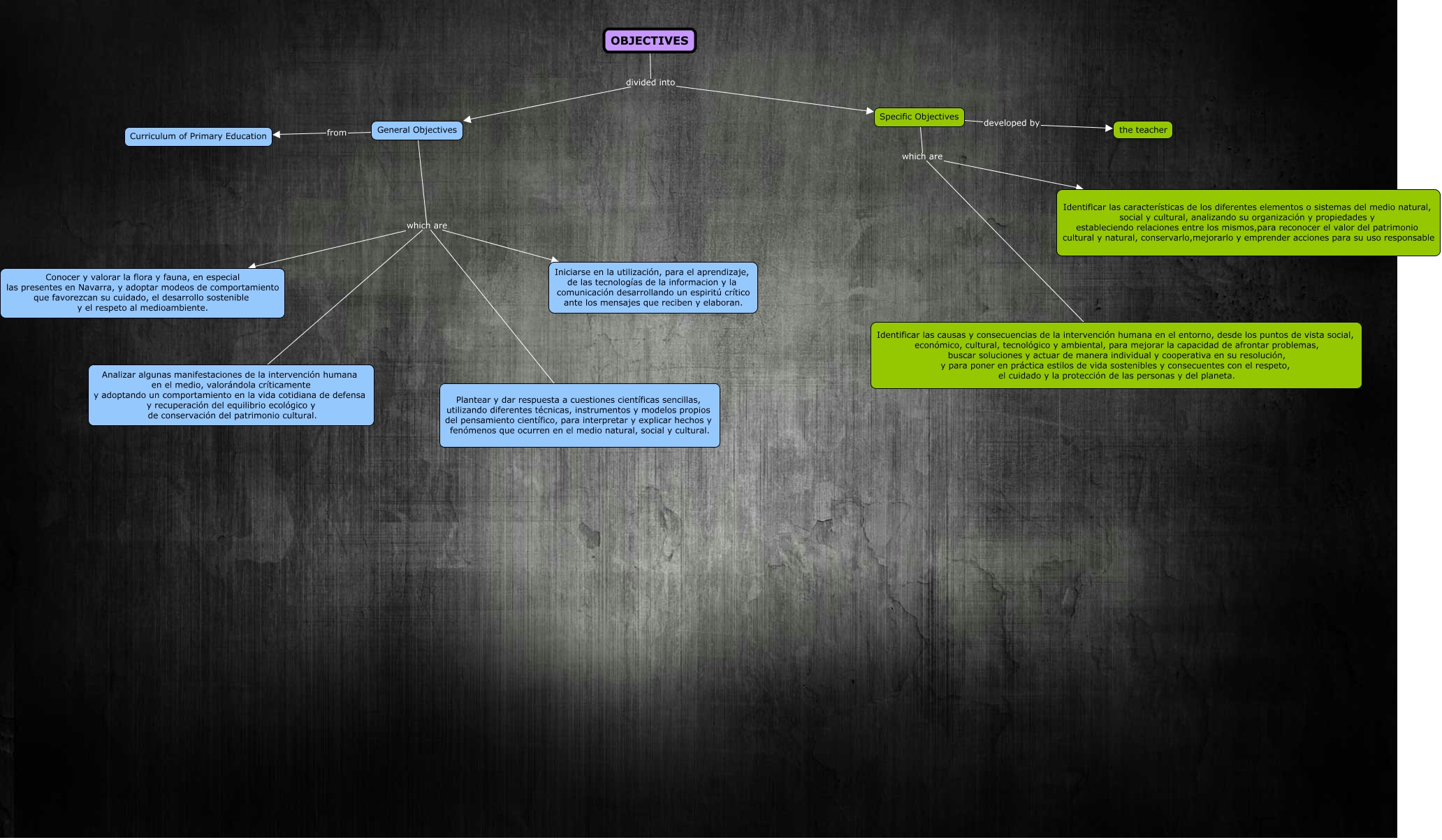 Este Cmap, tiene información relacionada con: Objectives, General Objectives which are Analizar algunas manifestaciones de la intervención humana en el medio, valorándola críticamente y adoptando un comportamiento en la vida cotidiana de defensa y recuperación del equilibrio ecológico y de conservación del patrimonio cultural., General Objectives which are Iniciarse en la utilización, para el aprendizaje, de las tecnologías de la informacion y la comunicación desarrollando un espiritú crítico ante los mensajes que reciben y elaboran., OBJECTIVES divided into Specific Objectives, General Objectives which are Conocer y valorar la flora y fauna, en especial las presentes en Navarra, y adoptar modeos de comportamiento que favorezcan su cuidado, el desarrollo sostenible y el respeto al medioambiente., Specific Objectives which are Identificar las características de los diferentes elementos o sistemas del medio natural, social y cultural, analizando su organización y propiedades y estableciendo relaciones entre los mismos,para reconocer el valor del patrimonio cultural y natural, conservarlo,mejorarlo y emprender acciones para su uso responsable, General Objectives which are Plantear y dar respuesta a cuestiones científicas sencillas, utilizando diferentes técnicas, instrumentos y modelos propios del pensamiento científico, para interpretar y explicar hechos y fenómenos que ocurren en el medio natural, social y cultural., General Objectives from Curriculum of Primary Education, Specific Objectives which are Identificar las causas y consecuencias de la intervención humana en el entorno, desde los puntos de vista social, económico, cultural, tecnológico y ambiental, para mejorar la capacidad de afrontar problemas, buscar soluciones y actuar de manera individual y cooperativa en su resolución, y para poner en práctica estilos de vida sostenibles y consecuentes con el respeto, el cuidado y la protección de las personas y del planeta., Specific Objectives developed by the teacher, OBJECTIVES divided into General Objectives