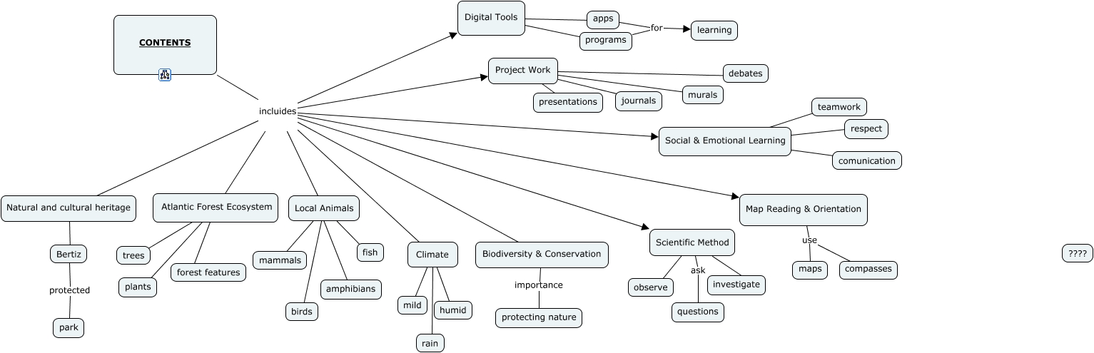 Este Cmap, tiene información relacionada con: Contents, Biodiversity & Conservation importance protecting nature, Local Animals ???? mammals, Map Reading & Orientation use compasses, Local Animals ???? amphibians, CONTENTS incluides Scientific Method, Project Work ???? murals, CONTENTS incluides Map Reading & Orientation, Climate ???? mild, Project Work ???? presentations, Climate ???? rain, Atlantic Forest Ecosystem ???? forest features, CONTENTS incluides Natural and cultural heritage, Natural and cultural heritage ???? Bertiz, CONTENTS incluides Social & Emotional Learning, Project Work ???? debates, Digital Tools ???? apps, Scientific Method ???? investigate, CONTENTS incluides Digital Tools, Atlantic Forest Ecosystem ???? trees, CONTENTS incluides Atlantic Forest Ecosystem