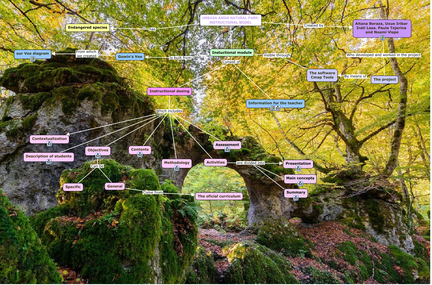 Este Cmap, tiene información relacionada con: Sin Título, Instructional desing Which includes Activities, Activities are divided into Summary, Activities are divided into Presentation, Instuctional module Consist of Information for the teacher, Activities are divided into Main concepts, Gowin's Vee From which we created our Vee diagram, Objectives Can be General, Instructional desing Which includes Contextualization, Instructional desing Which includes Assessment, Aitana Beraza, Uxue Iribar Irati Lasa. Paula Tejerina and Noemí Vispe Who developed and worked in the project The project, Instructional desing Which includes Contents, Instuctional module Is built from Gowin's Vee, The project By means of The software Cmap Tools, URBASA ANDIA NATURAL PARK: INSTRUCTIONAL MODEL has Endangered species, Instructional desing Which includes Objectives, URBASA ANDIA NATURAL PARK: INSTRUCTIONAL MODEL Is Instuctional module, Instructional desing Which includes Description of students, General Come from The oficial curriculum, URBASA ANDIA NATURAL PARK: INSTRUCTIONAL MODEL Created by Aitana Beraza, Uxue Iribar Irati Lasa. Paula Tejerina and Noemí Vispe, Instructional desing Which includes Methodology