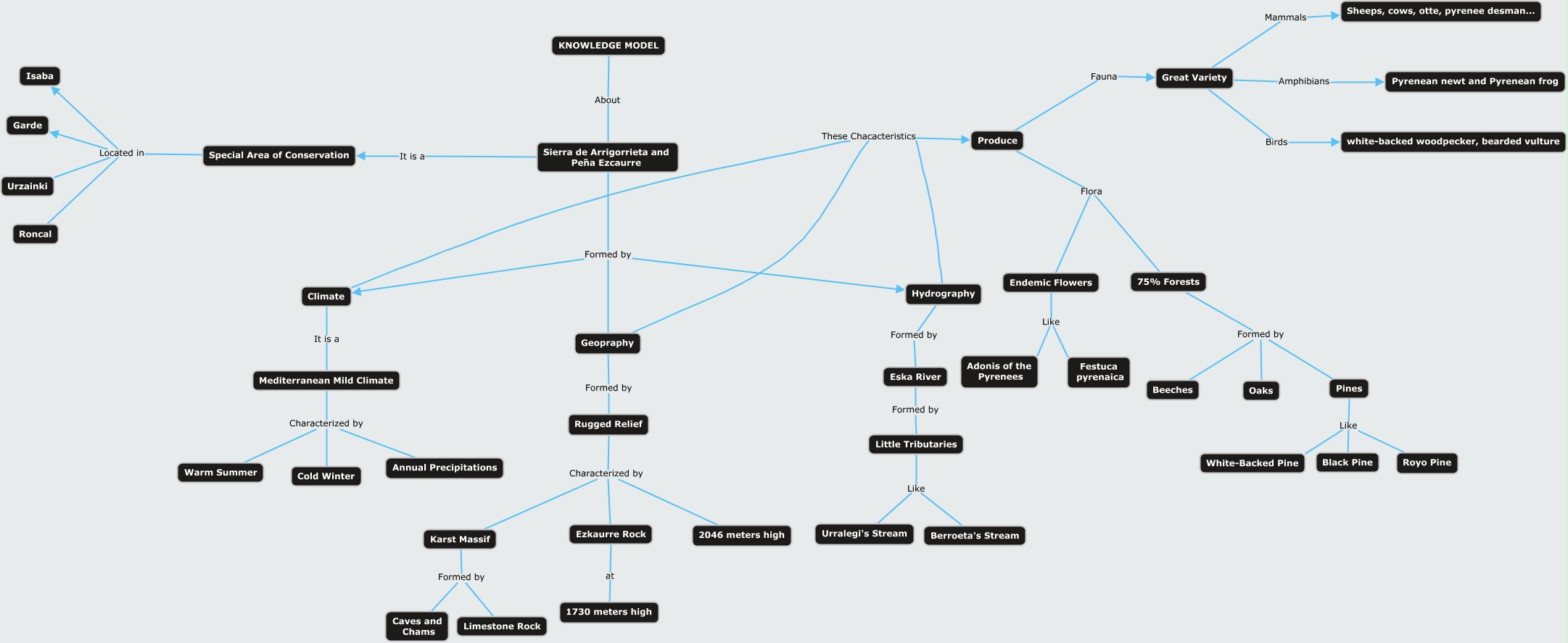 Este Cmap, tiene información relacionada con: Knowledge model, Geopraphy These Chacacteristics Produce, 75% Forests Formed by Pines, Karst Massif Formed by Limestone Rock, Special Area of Conservation Located in Roncal, Climate These Chacacteristics Produce, 75% Forests Formed by Beeches, Geopraphy Formed by Rugged Relief, Special Area of Conservation Located in Garde, Produce Flora 75% Forests, Eska River Formed by Little Tributaries, Little Tributaries Like Berroeta's Stream, Special Area of Conservation Located in Urzainki, Rugged Relief Characterized by 2046 meters high, Great Variety Birds white-backed woodpecker, bearded vulture, Pines Like Black Pine, Sierra de Arrigorrieta and Peña Ezcaurre Formed by Hydrography, Hydrography Formed by Eska River, Pines Like White-Backed Pine, Sierra de Arrigorrieta and Peña Ezcaurre It is a Special Area of Conservation, Great Variety Amphibians Pyrenean newt and Pyrenean frog