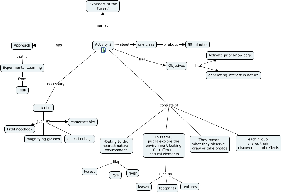 Este Cmap, tiene información relacionada con: Activity 2, Activity 2 consists of -Outing to the nearest natural environment, Activity 2 named ‘Explorers of the Forest’, Objetives like Activate prior knowledge, Activity 2 has Objetives, Activity 2 consists of each group shares their discoveries and reflects, Activity 2 about one class, Approach that is Experimental Learning, materials such as collection bags, -Outing to the nearest natural environment like river, Experimental Learning from Kolb, Activity 2 consists of They record what they observe, draw or take photos, materials such as camera/tablet, In teams, pupils explore the environment looking for different natural elements such as textures, -Outing to the nearest natural environment like Park, materials such as magnifying glasses, In teams, pupils explore the environment looking for different natural elements such as leaves, In teams, pupils explore the environment looking for different natural elements such as footprints, Objetives like generating interest in nature, Activity 2 has Approach, Activity 2 consists of In teams, pupils explore the environment looking for different natural elements