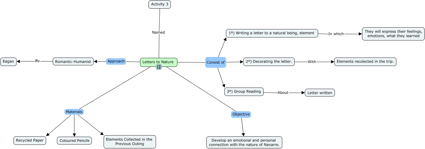 Este Cmap, tiene información relacionada con: Activity 3, Activity 3 Named Letters to Nature, Letters to Nature Materials Elements Collected in the Previous Outing, Letters to Nature Materials Recycled Paper, Letters to Nature Materials Coloured Pencils, Letters to Nature Consist of 1º) Writing a letter to a natural being, element, 2º) Decorating the letter. With Elements recolected in the trip., 1º) Writing a letter to a natural being, element In which They will express their feelings, emotions, what they learned, Letters to Nature Consist of 2º) Decorating the letter., Letters to Nature Objective Develop an emotional and personal connection with the nature of Navarre., Letters to Nature Consist of 3º) Group Reading, Romantic-Humanist By Eagan, 3º) Group Reading About Letter written, Letters to Nature Approach Romantic-Humanist