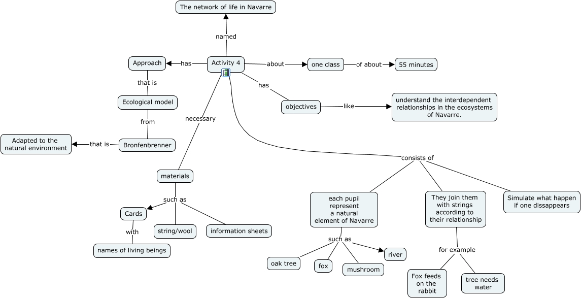 Este Cmap, tiene información relacionada con: Activity 4, Activity 4 has objectives, each pupil represent a natural element of Navarre such as river, Activity 4 necessary materials, each pupil represent a natural element of Navarre such as mushroom, Activity 4 consists of each pupil represent a natural element of Navarre, Bronfenbrenner that is Adapted to the natural environment, Activity 4 about one class, Ecological model from Bronfenbrenner, Activity 4 consists of Simulate what happen if one dissappears, They join them with strings according to their relationship for example tree needs water, Approach that is Ecological model, Activity 4 named The network of life in Navarre, materials such as Cards, materials such as string/wool, They join them with strings according to their relationship for example Fox feeds on the rabbit, materials such as information sheets, Activity 4 consists of They join them with strings according to their relationship, each pupil represent a natural element of Navarre such as fox, objectives like understand the interdependent relationships in the ecosystems of Navarre., Cards with names of living beings
