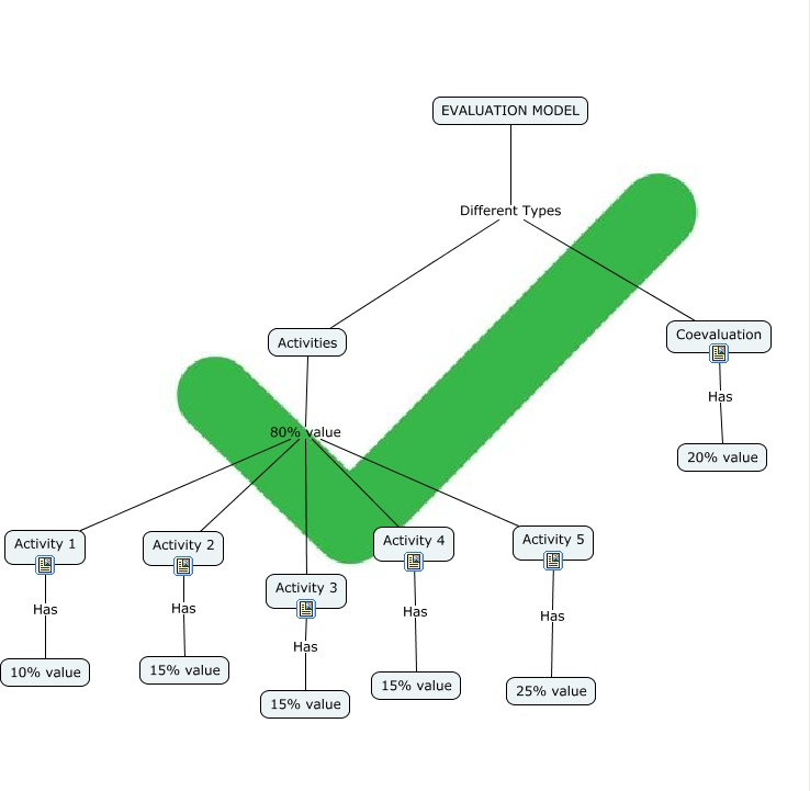 Este Cmap, tiene información relacionada con: Evaluation, Activity 3 Has 15% value, Activities 80% value Activity 5, EVALUATION MODEL Different Types Coevaluation, Activity 1 Has 10% value, Activity 2 Has 15% value, Activities 80% value Activity 2, Coevaluation Has 20% value, Activities 80% value Activity 1, EVALUATION MODEL Different Types Activities, Activity 5 Has 25% value, Activities 80% value Activity 3, Activities 80% value Activity 4, Activity 4 Has 15% value
