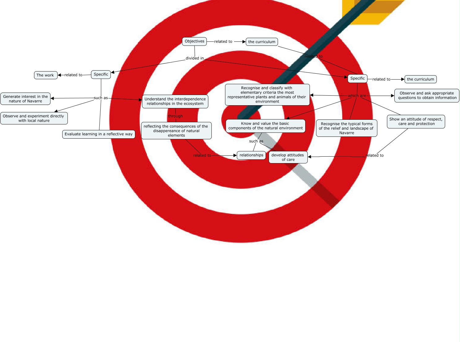 Este Cmap, tiene información relacionada con: Objectives, Specific such as Evaluate learning in a reflective way, Specific such as Generate interest in the nature of Navarre, Objectives divided in Specific, Specific which are Show an attitude of respect, care and protection, Understand the interdependence relationships in the ecosystem through reflecting the consequences of the disappereance of natural elements, Specific which are Know and value the basic components of the natural environment, the curriculum related to Specific, Specific which are Observe and ask appropriate questions to obtain information, Specific such as Observe and experiment directly with local nature, Specific related to The work, Know and value the basic components of the natural environment such as develop attitudes of care, Show an attitude of respect, care and protection related to develop attitudes of care, Objectives related to the curriculum, reflecting the consequences of the disappereance of natural elements related to relationships, Specific such as Understand the interdependence relationships in the ecosystem, Specific which are Recognise the typical forms of the relief and landscape of Navarre, Specific related to the curriculum, Objectives divided in Specific, Specific which are Recognise and classify with elementary criteria the most representative plants and animals of their environment, Know and value the basic components of the natural environment such as relationships