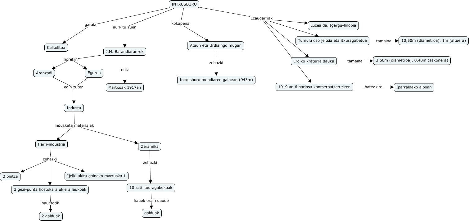 Este Cmap, tiene información relacionada con: INTXUSBURU, Industu indusketa materialak Zeramika, Zeramika zehazki 10 zati itxuragabekoak, INTXUSBURU aurkitu zuen J.M. Barandiaran-ek, Eguren egin zuten Industu, INTXUSBURU Ezaugarriak Luzea da, Igargu-hilobia, Harri-industria zehazki 2 pintza, INTXUSBURU garaia Kalkolitoa, Erdiko kraterra dauka tamaina 3,60m (diametroa), 0,40m (sakonera), INTXUSBURU Ezaugarriak 1919 an 6 harlosa kontserbatzen ziren, J.M. Barandiaran-ek noiz Martxoak 1917an, 10 zati itxuragabekoak hauek orain daude galduak, Harri-industria zehazki 3 gezi-punta hostokara ukiera laukoak, Aranzadi egin zuten Industu, Tumulu oso jeitsia eta itxuragabetua tamaina 10,50m (diametroa), 1m (altuera), INTXUSBURU Ezaugarriak Tumulu oso jeitsia eta itxuragabetua, Harri-industria zehazki Ijelki ukitu gaineko marruska 1, Industu indusketa materialak Harri-industria, INTXUSBURU kokapena Ataun eta Urdiaingo mugan, Ataun eta Urdiaingo mugan zehazki Intxusburu mendiaren gainean (943m), 3 gezi-punta hostokara ukiera laukoak hauetatik 2 galduak