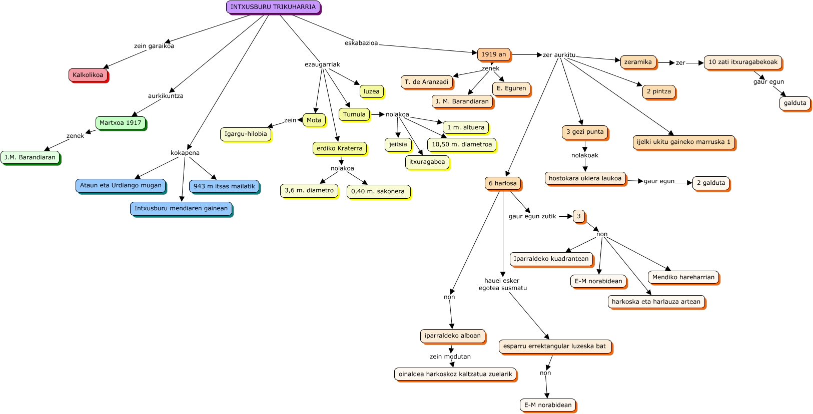 Este Cmap, tiene información relacionada con: INTXUSBURU trikuharria, 1919 an zenek E. Eguren, 1919 an zer aurkitu ijelki ukitu gaineko marruska 1, INTXUSBURU TRIKUHARRIA ezaugarriak Mota, 1919 an zer aurkitu zeramika, INTXUSBURU TRIKUHARRIA zein garaikoa Kalkolikoa, 1919 an zer aurkitu 2 pintza, Martxoa 1917 zenek J.M. Barandiaran, INTXUSBURU TRIKUHARRIA ezaugarriak luzea, 1919 an zer aurkitu 6 harlosa, Tumula nolakoa 10,50 m. diametroa, Mota zein Igargu-hilobia, 10 zati itxuragabekoak gaur egun galduta, 3 non harkoska eta harlauza artean, Tumula nolakoa itxuragabea, INTXUSBURU TRIKUHARRIA ezaugarriak Tumula, erdiko Kraterra nolakoa 3,6 m. diametro, INTXUSBURU TRIKUHARRIA eskabazioa 1919 an, 3 non Iparraldeko kuadrantean, INTXUSBURU TRIKUHARRIA kokapena 943 m itsas mailatik, 6 harlosa non iparraldeko alboan